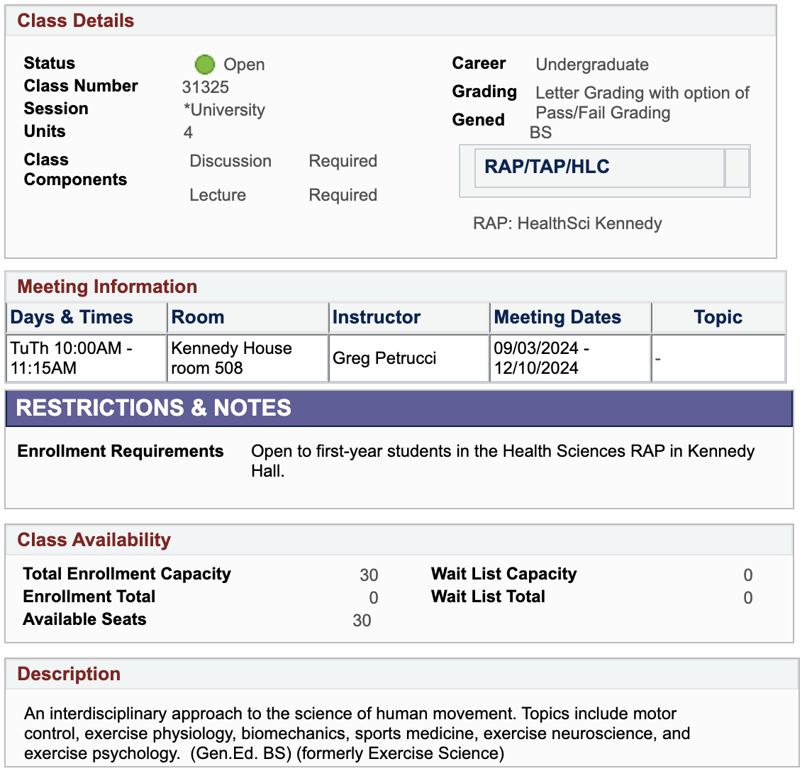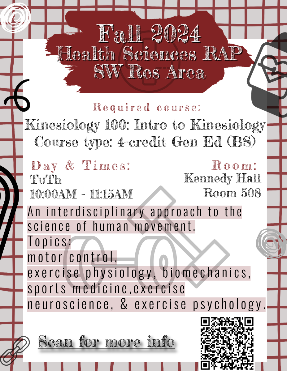 You need not enroll in any prerequisite courses to enroll in this introductory course, which assumes no background knowledge in kinesiology. However, you must be a first-year student in the Health Sciences RAP in Kennedy Hall. All Fall 2024 RAPs are listed here. This class is listed under Southwest Residential Area -> Kennedy Hall -> Health Sciences RAP