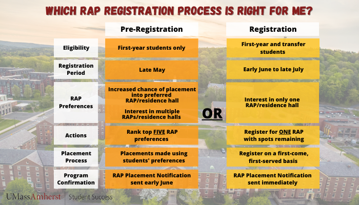 - First-year & transfer students can register for remaining spaces on a first-come, first-served basis. Students cannot make changes to their RAP registration after they’ve met with their academic advisor.
